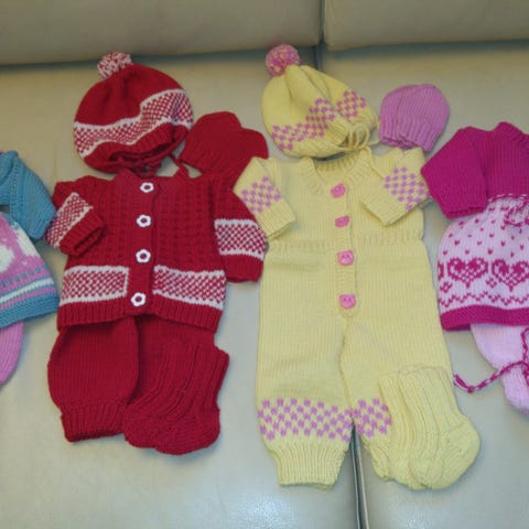 1: Hjemmestrikket sett med lue, jakke, bukse og sokker. Kr 150,-