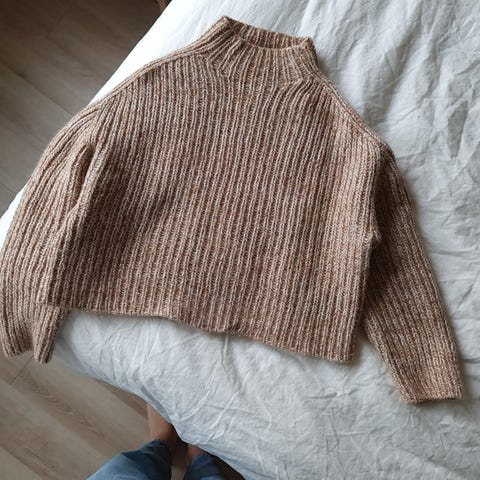 Superfin håndstrikket genser med striper og båthals. Genseren er størrelse M og strikket i Pickles tjukk merino. Aldri brukt. Garnpris: 990,-
