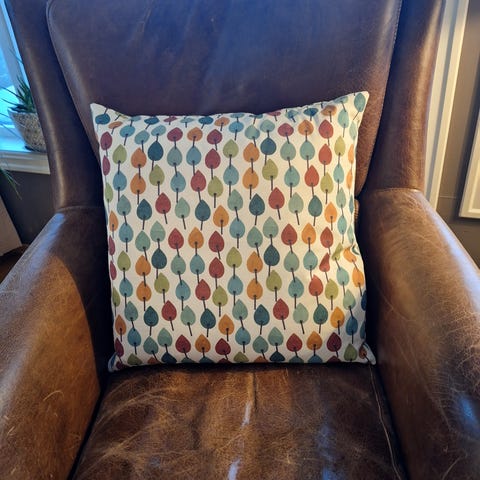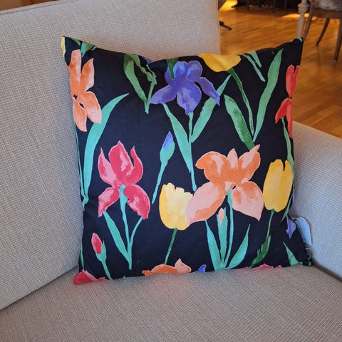 Sydd pyntepute i flerfarget, vevd stoff, morsomt mønster. Puten har sort bakside, sydd bomulls stoff og med glidelås.