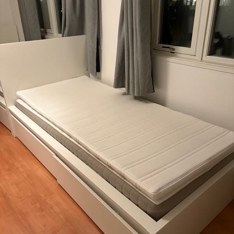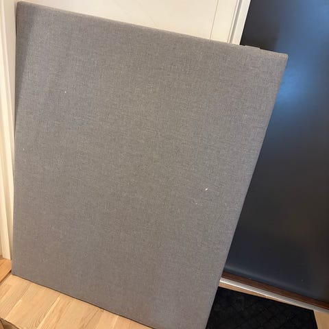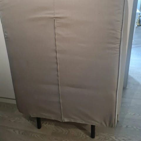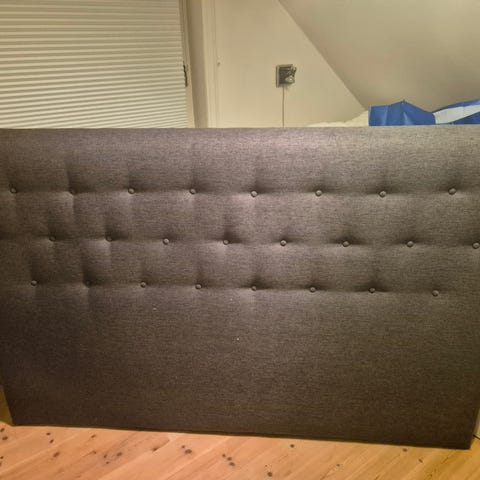 Selger en pent brukt, stofftrukket sengegavl i nøytral grå/beige farge.
