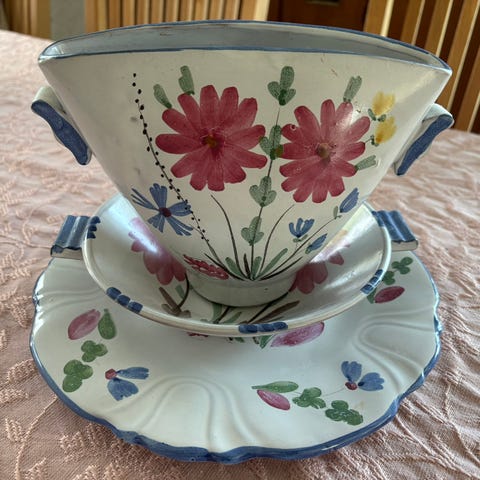 Keramikkflaske med hank, dekorert med blå blomster og et ansikt i relieff. Flasken har en smal åpning og er laget i keramisk materiale med blå og grå fargetoner. Egnet for dekorasjon eller oppbevaring av væsker.