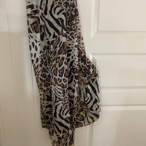 Stort silke skjerf (tror det er silke, men ingen lapp) i flerfarget design. Laget av veldig mykt vevd stoff, og varmt og lunt. Det har frynser i endene.
