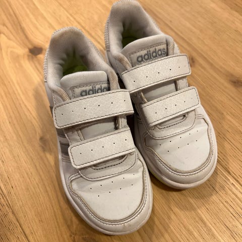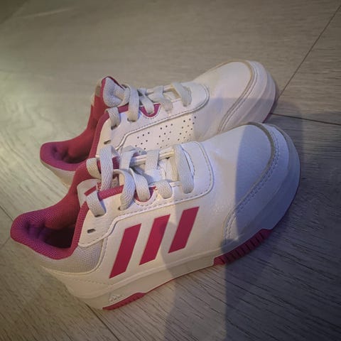 Adidas unisex barnesko i størrelse 28. Skoene er hvite med flerfargede striper i gult, rosa og grønt. De har borrelås og snøring.