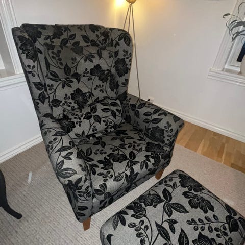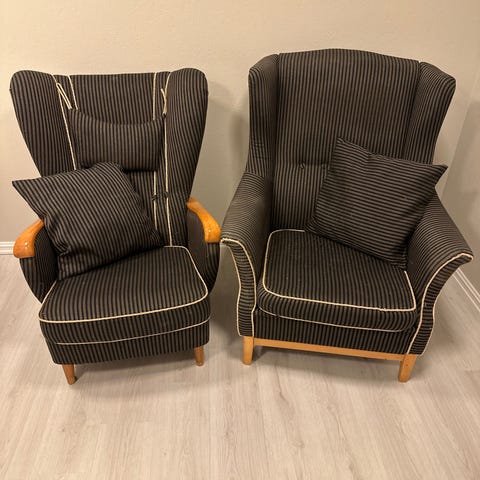 To godt brukte stoler, trenger rens. Noe slitt i stoffet, men ingen hull. Selges samlet for kr 1.500.- eller bud. Kjøpt på Novasolo i sin tid.