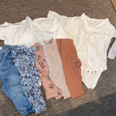 Klespakke på 6 bodyer og 2 bukser. H&M, Hummel, Lil’ Atelier og KappAhl. Pent brukt.