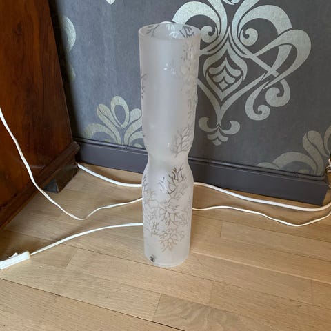 Bordlampe i frostglass med kule detaljer. Lampen er 46cm høy. Den har stått på gjesterommet så er som ny. Selges pga flytting . Kan hentes hos meg,sendes eller møtes.