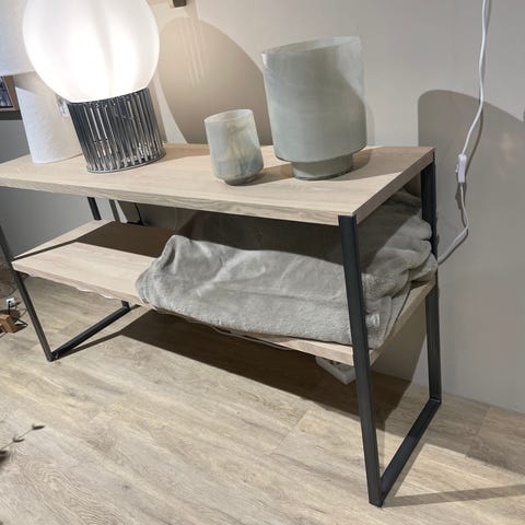 Selger et lite brukt konsollbord fra danske Kristensen&Kristensen. En del av Woodstory serien til Møbelringen. Modell J. Ask, lys gråoljet (C-13). Med hylle. Børstet stålben.