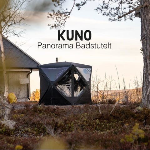 Kuno Panorama har alt du kan ønske deg av et badstutelt og vi håper du vil like det like mye som oss. Badstuteltet skiller seg ut med sine to store, vertikale panoramavinduer og to horisontale vinduer som slipper inn naturlig lys og gir en fantastisk utsikt. Vi har plassert gardiner på innsiden av disse så man kan lette justere disse - samtidig som de beskytter vinduene når teltet slåes sammen. Det slitesterke stoffet er både robust og elegant, noe som sikrer lang levetid og et førsteklasses uttrykk. Teltet har Oxford tekstil i 420d på utsiden og 300d på innsiden. Med en vekt på 17 kg og en smart pop-up-funksjon settes teltet opp på bare 5 minutter – helt uten kompliserte teltstenger. Selve grunnflaten er 1,8m x 1,8 meter og 2,34 meter i hoftehøyde (+ at det trengs litt plass for bardunering). Diagonalt fra hjørnet til hjørnet er det 2,55. Enten du ser utover havet, fjellet eller bare lar deg fascinere av hagen, så håper vi du blir fornøyd med ditt nye Kuno Panorama badstutelt!