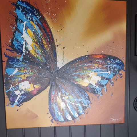 Har fått en del merker på både ramme og lerret. Se bilder.