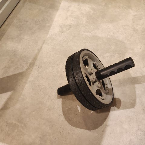 Treningsapparat med metallramme og skumruller i lilla farge. Designet for kroppsøvelser og styrketrening.