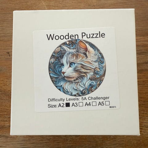 Puslespillet er laget av tre og kommer i en praktisk oppbevaringsboks.