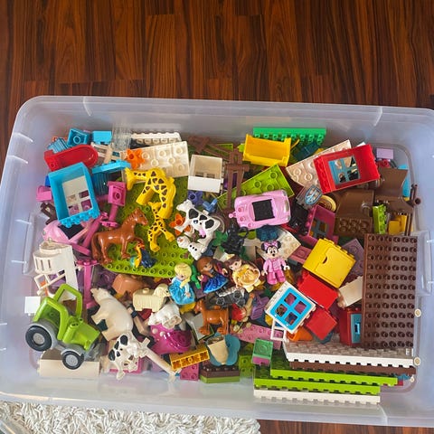 Proppfull eske med DUPLO. Følger også med noen dyr og figurer. Kjøpt brukt i fjor og ble lite brukt hos oss. Det mangler nok noen deler, og har ikke satt sammen div for å se hva som mangler.