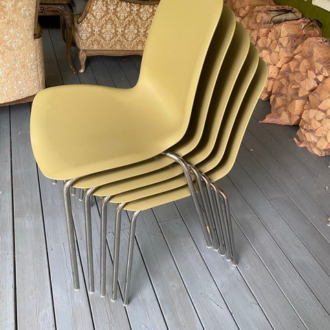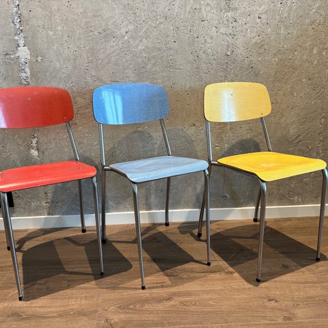 Fire malte stoler i forskjellige farger gis bort mot henting