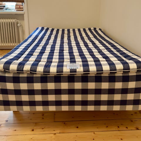 Vi har brukt en annen overmadrass (nypris ca. 20 000 kr). Denne er ikke fra Hästens, men kan følge med om ønskelig. Sengen kan også kjøpes uten overmadrass.