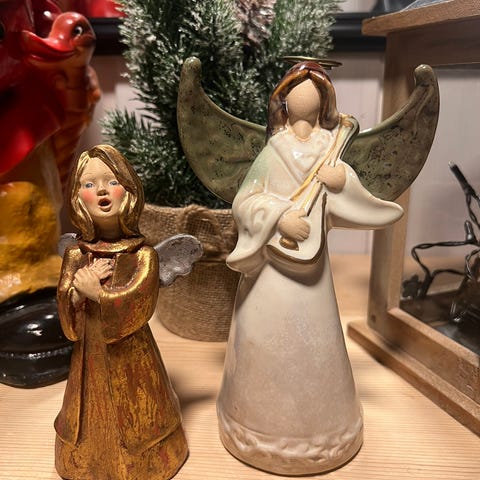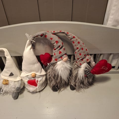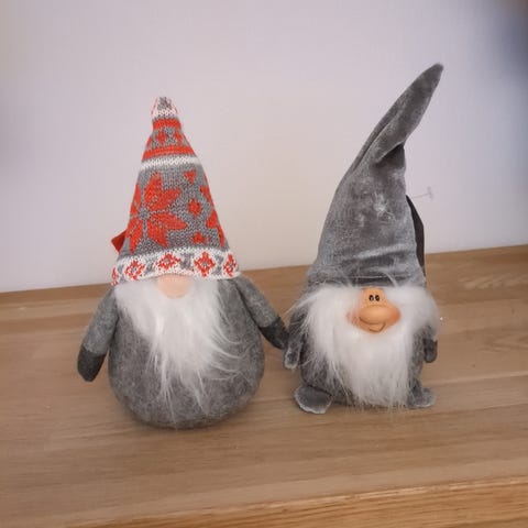 2x store nisser. Den nissen med hvit jakke er ca 25 cm lang. Nissen med rød og grå jakke er ca 32 cm lang. Selges sammen.