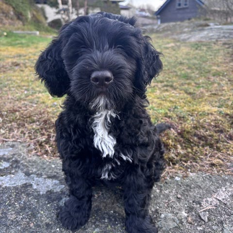 Vi har fått et kull med portugisisk vannhund etter våre to egne hunder, Caimana (mor) og Septimus (far).