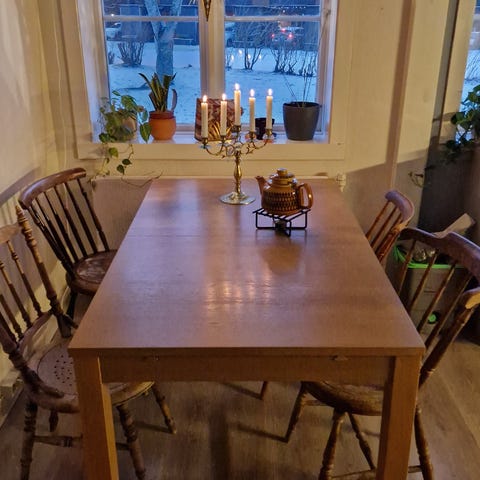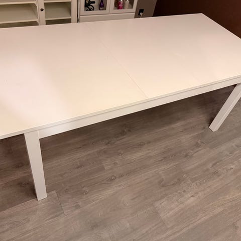 Har noen merker på bordplate- se bilder. Men er hellers uten skader eller mangler. Praktisk bord der ileggsplater oppbevares under bordet.