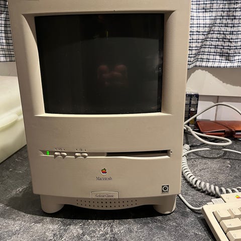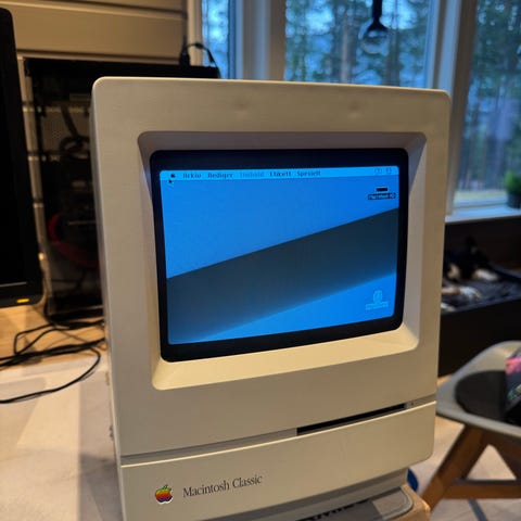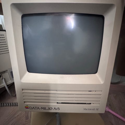 Lufter denne gamle Apple Macintosh Classic stasjonære datamaskinen for salg. Produsert November 1990.