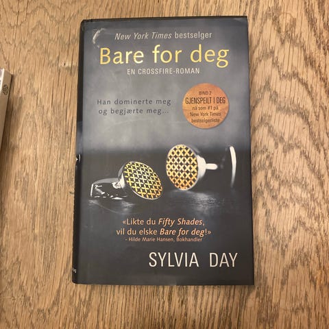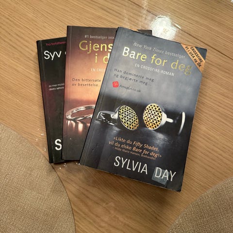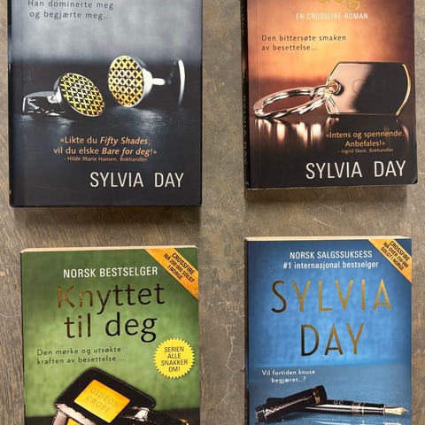 Sylvia Day bøker inkludert titlene Gjenspeilt i deg, Grepet av deg og Bare for de. Bøkene er på norsk og tilhører sjangeren romantikk/erotisk litteratur. Selges 100kr stk.