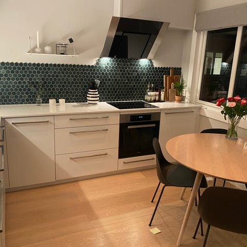 Kvalitetskjøkken Studio fra Drømmekjøkkenet selges. Benkeplate i massiv eik, 4 cm tykk, som vi tror er fra Spekva som har benkeplater av høy kvalitet. Skuffene har softclose funksjon. Alt fungerer helt fint bortsett fra vifta som bør skiftes da den mangler en glassplate. Inkludert er kjøleskap/ fryser og microbølgeovn. Fronten til oppvaskmaskin inngår men beina på det frittstående skapet inngår ikke.