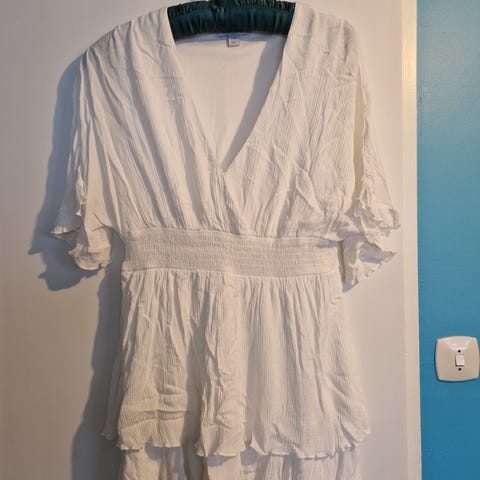 Nydelig hvit kjole med fake diamanter på selges da den ble for stor til meg. Kjøpte en ny i størrelse medium som jeg hadde på meg i bryllupsfesten min. Be om bilder hvis du vil se den på.