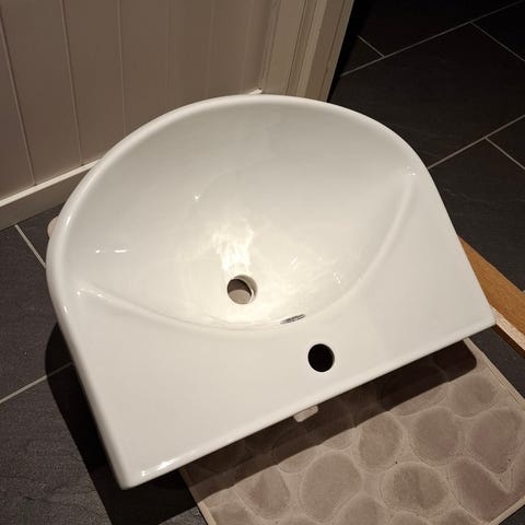 Gustavsberg liten servant i hvit porselen med tilhørende krom oras - armatur og overløp. Servanten har et hull for kranmontering og avløp i bunn. Passer for veggmontering i baderom.
