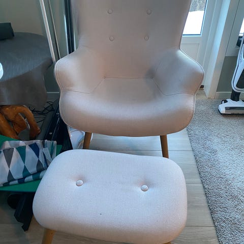 Den er veldig fluffy og myk og sitte i. Har recliner knapp på siden som fungerer optimalt.