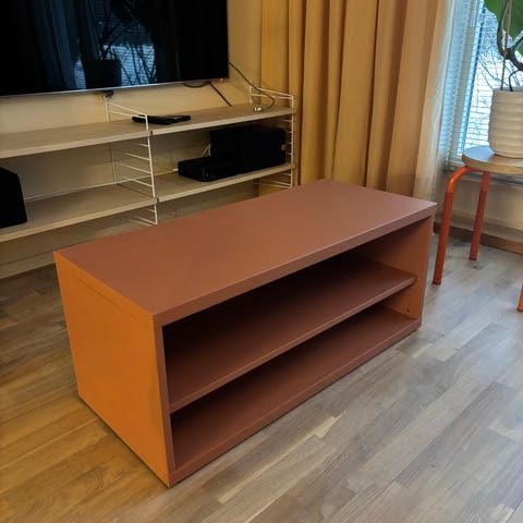 Praktisk og stilren TV-benk fra IKEA i hvit utførelse. God plass til TV og medieutstyr, med åpne hyller som gjør det enkelt å organisere bokser, spillkonsoller og annet tilbehør.