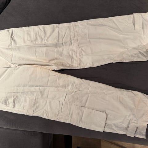H&M Cargo Bukse for dame i størrelse XL. Buksen er sort og har elastiske mansjetter ved anklene. Laget av 100% polyester med detaljer i 96% polyester og 4% elastan. Designet med flere lommer, egnet for hverdagsbruk.