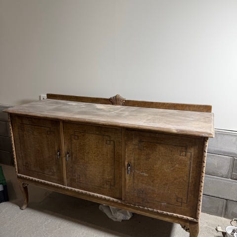 Solid og pen skjenk. Opprinnelig hvit, malt grå og byttet knotter.
