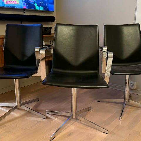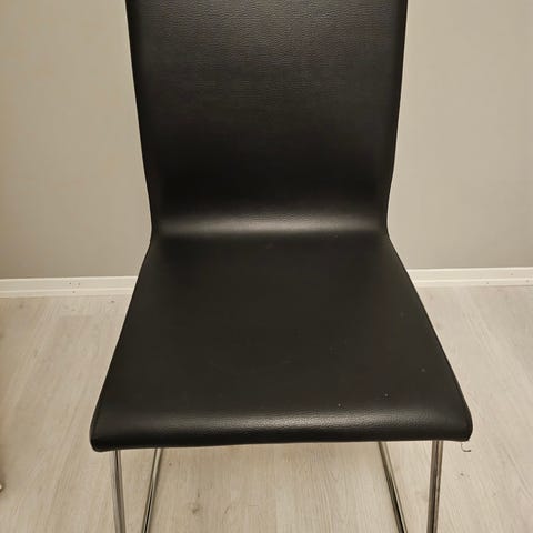 Komfortable stoler trukket i svart skinn. Stolene har moderne design og er svært behagelige. Setet er polstret og formet for å redusere trykk, og den fleksible ryggstøtten gir god støtte.