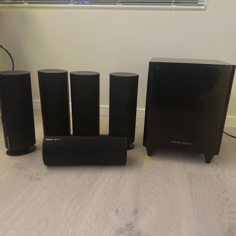 Harman Kardon høyttalersystem bestående av fire satellitthøyttalere, en senterhøyttaler og en subwoofer. Systemet har en svart finish.