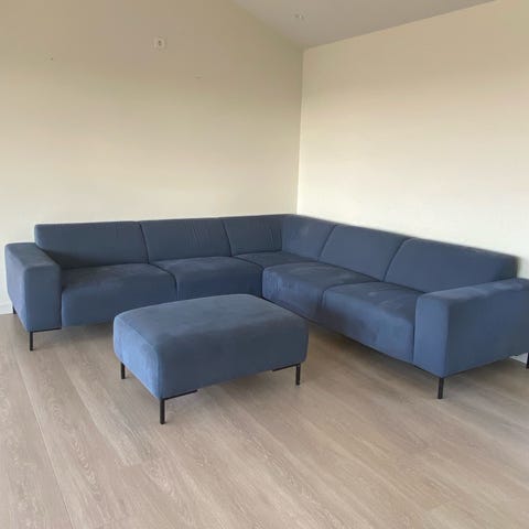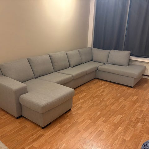 Selger en stor og komfortabel hjørnesofa i grå farge. Sofaen er ca. 5 år gammel og er i veldig god stand, uten skader eller slitasje.