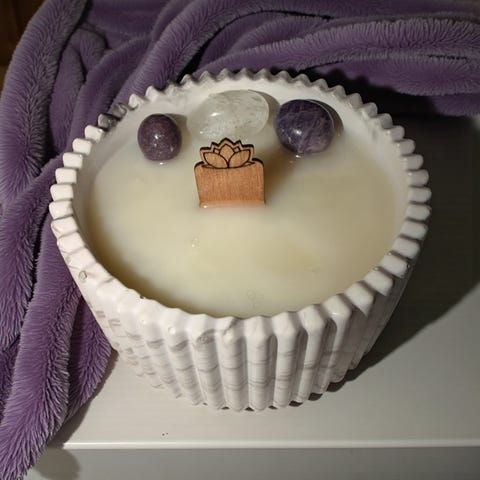 Flaske lampe som inneholder grønn Adventurin, lavendel blomst og andre tørkete blomster, mose og Rosenkvarts små krystaller. Lyset går for 3-AAA batterier og den endrer fargen. Størrelse er ca. 12 cm i høyden og ca. 8 cm i bredden.