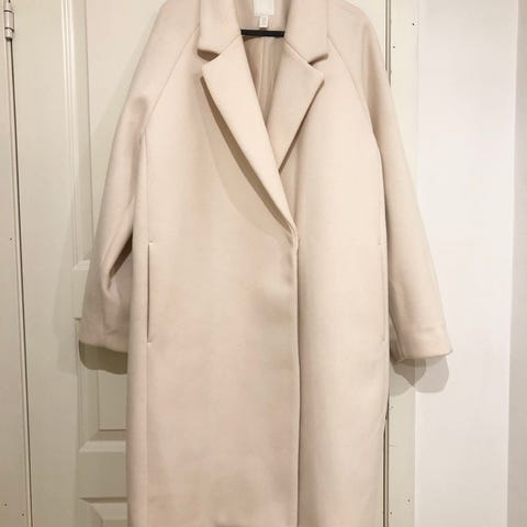 50 kr pr stk. Den beige jakken er 50% akryl og 50% viskose og str S.Den blå er 83% bomull og 17% polyamid, str M.