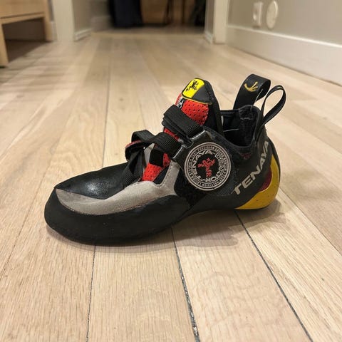 Tenaya Ra klatresko i fargene orange, hvit og svart. Brukt kun en gang. Størrelse 9 UK