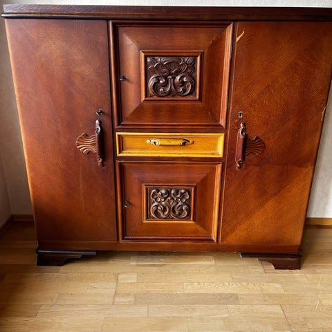Antikk skjenk i mørkt tre med utskjæringer og nøkkellås