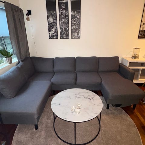 Veldig fint brukt u sofa ser ut bra ingen flekker og ingen skader alle putene kan ta av å vaske