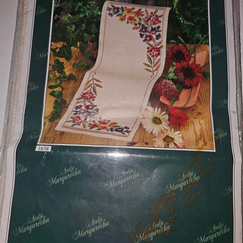 Knapt påbegynt broderingsstykke(1cm). Medfølger 4 trådsneller, 6 broderingsnåler og voks.