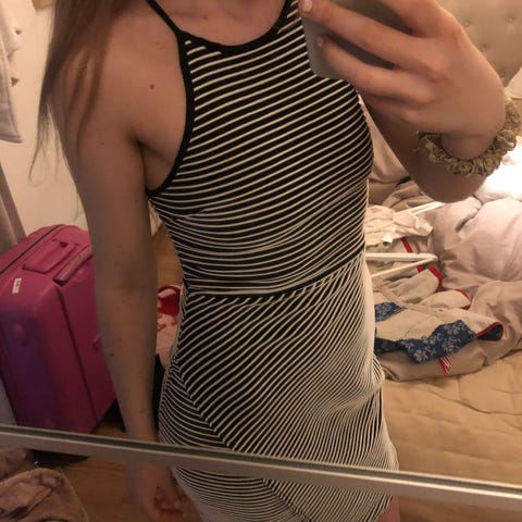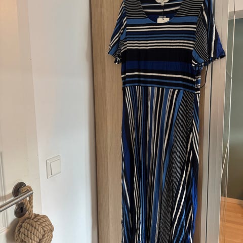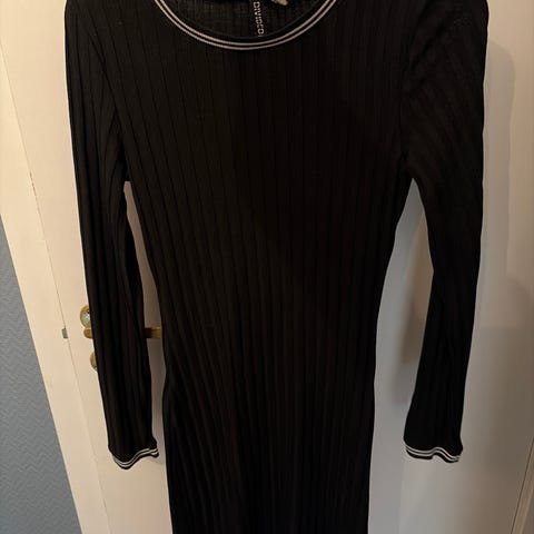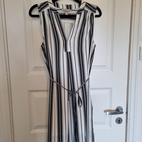 Sort og hvit stripet kjole. Splitt på begge sidene og knytebånd. Ubrukt