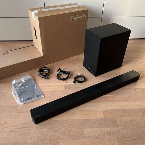 Kommer med fjernkontroll, lydplanke, subwoofer og tilhørende ledninger. Fungerer fint, og løfter TV-lyden betraktelig!