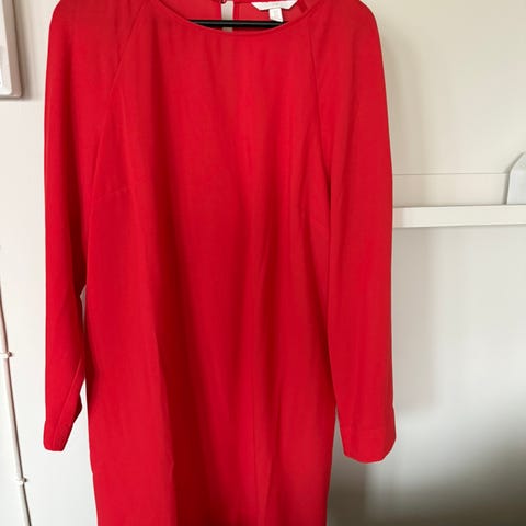 Nydelig rød kjole i lett og luftig stoff med dekorative striper. Kjolen har lange ermer med strikk nederst, flatterende snitt og knytebelte i livet som gir en feminin silhuett. Perfekt til fest, julebord, bryllup eller andre anledninger – men kan også styles mer hverdagslig.