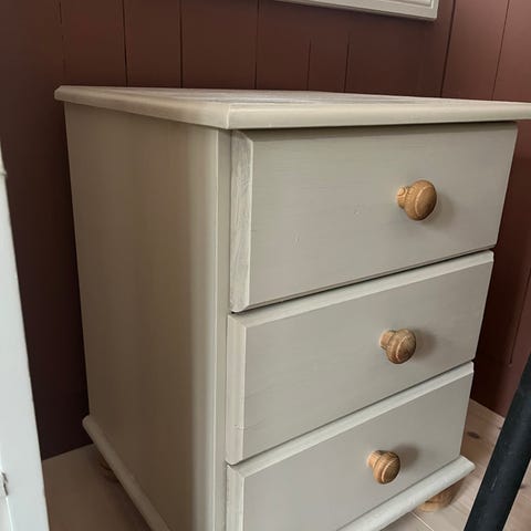 Kommode i furu selges billig. Normal bruksslitasje (se bilde av overflaten). Har stått i gangen på en hytte, så pent brukt. Skuffene skli bra. Kan slipes og males hvis man ønsker det☺️ Mål: 80*40*47,5. Må hentes i Asker.