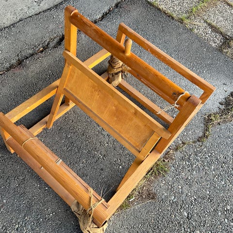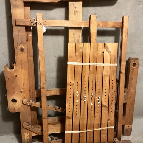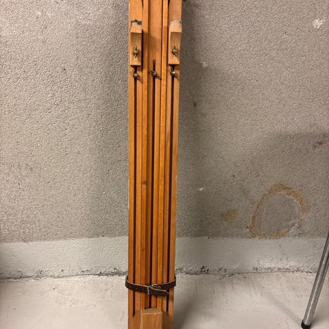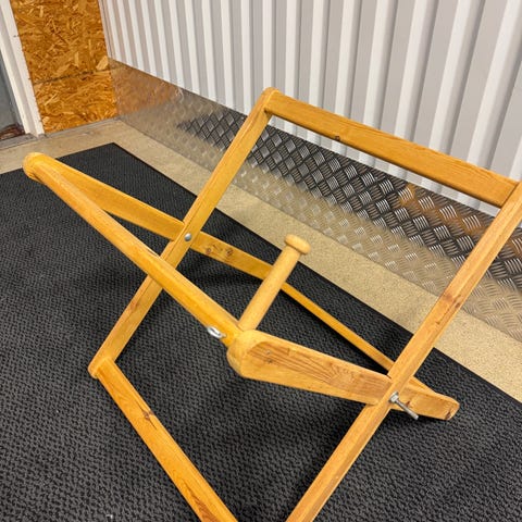 Ressigørstoler i bøk, opprinnelig kjøpt på Expo Nova Treklappstol med ramme i bøk og opprinnelig sete og ryggstøtte i linlerret. Stolen har armlener og sammenleggbar konstruksjon. Lerretet må skiftes.