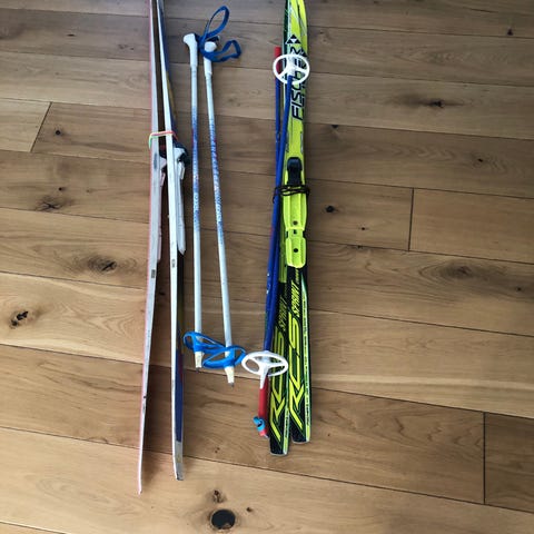 Leier ut smørefrie ski, staver, skisko og skøyter til barn. Størrelse på skiene er 90 cm, staver 75 cm, to par skisko i størrelse 28 og 29. Skøytene er i størrelse 28.