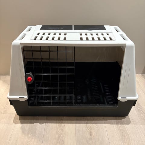 Buret har solide hengsler og låsemekanismer, og er egnet for sikker transport av hunder.