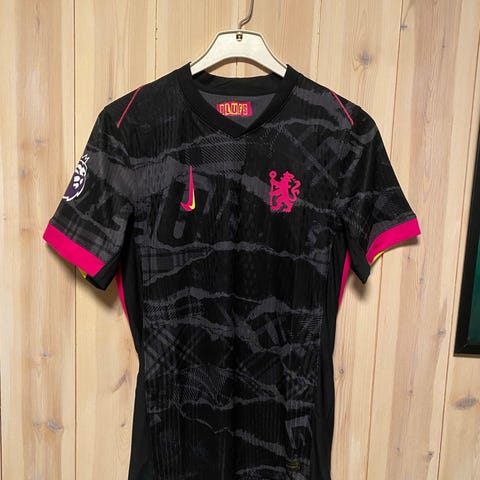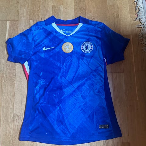 Nike Chelsea fotballtrøye i størrelse M. Trøyen er svart med Dri-FIT teknologi for fukttransport. Laget i Georgia. Designet for å være lett og pustende.