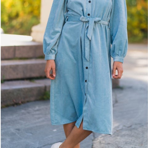Moss Copenhagen Hverdagskjole i størrelse S, laget av grønn cordfløyel. Kjolen har lang erm og glidelås foran. Materialet gir en myk og strukturert overflate, passer fint til hverdagsbruk.