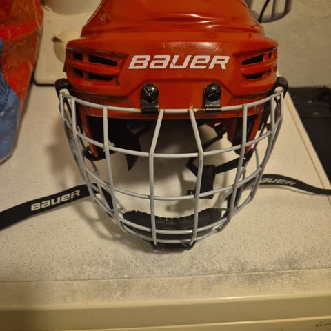 Ishockeyhjelm str M (56-59 cm). Brukt av undertegnede som heldigvis ikke har falt med den.