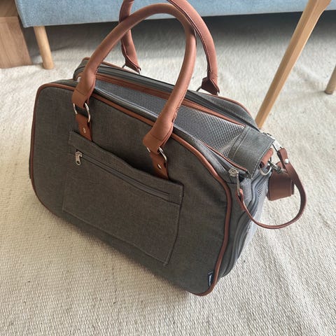 Grå og grønn bæreveske i fin stand. Kan brukes til både hund og katt. Passer små til medium dyr. Mål er 45 x 25 x 28 cm